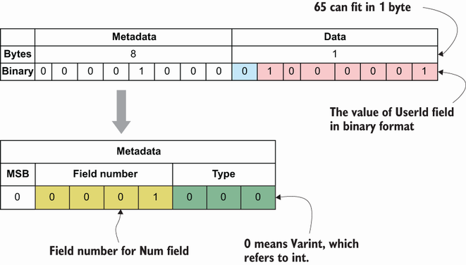 - 元数据部分用1个字节表示,并且前三位用于表示线型:000,即类型0(Varint),因为我们的数据类型是int。
