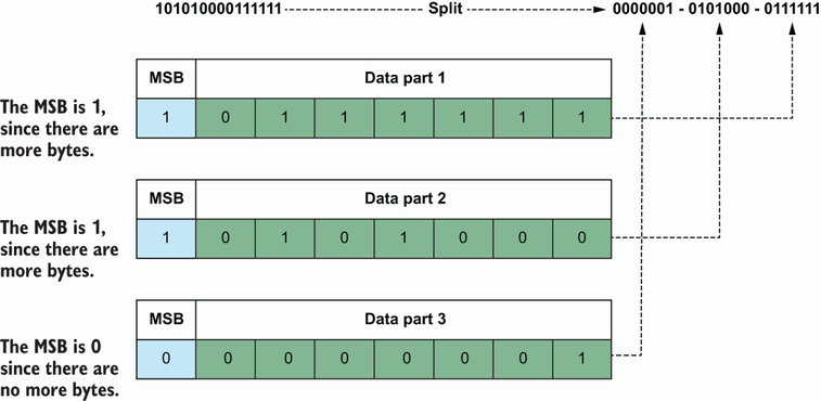 - 数据部分的第一位称为最高有效位(MSB),当没有额外的字节时其值为0。如果有更多字节来编码剩余数据,其值变为1。